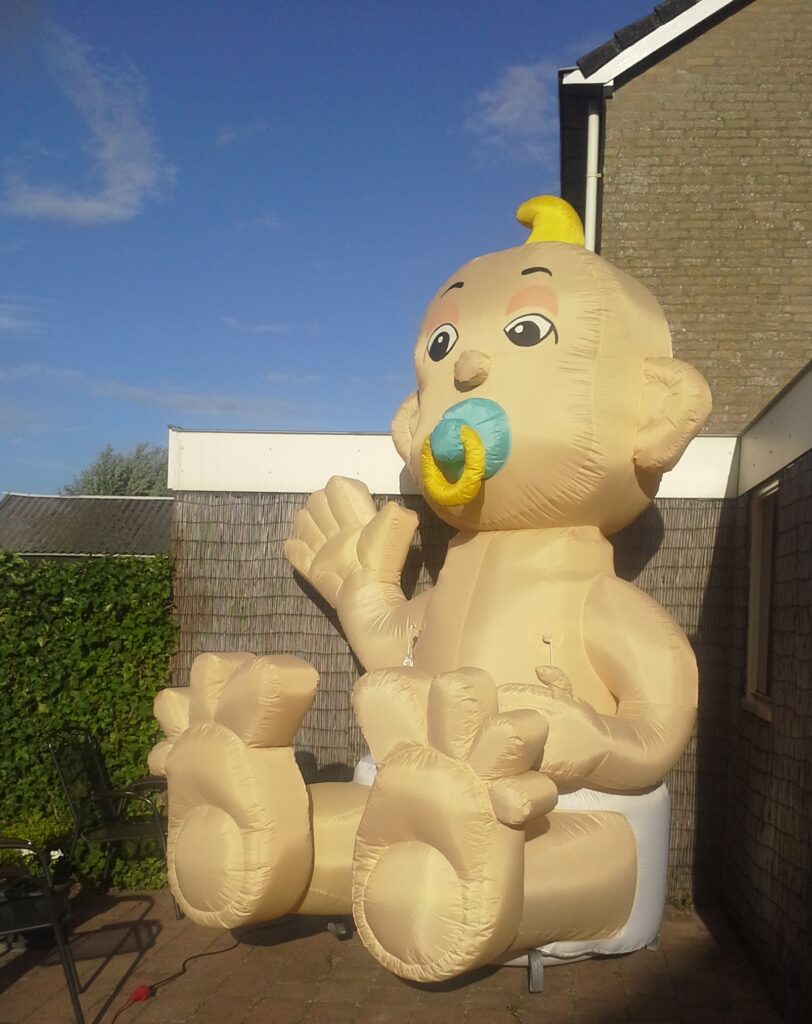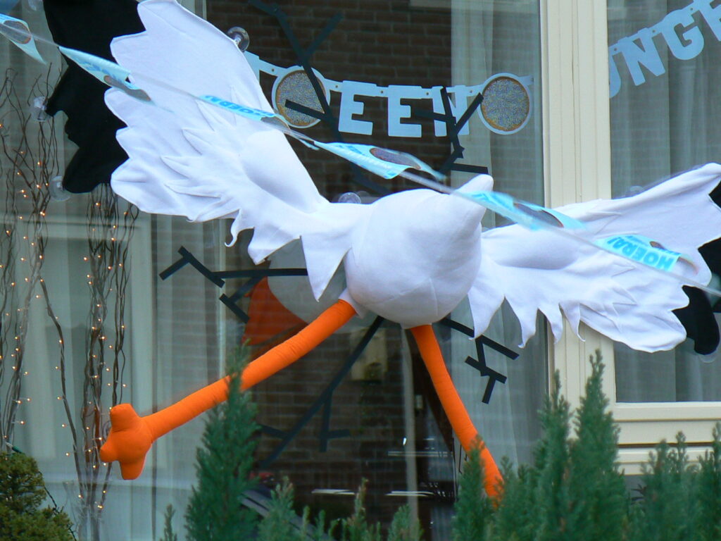 Huur deze super raam ooievaar bij de geboorte aankondiging van een baby.